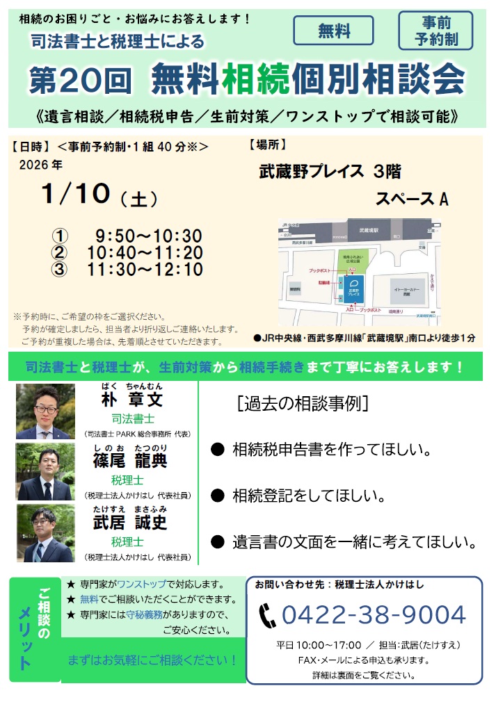 1/10(土)「司法書士と税理士による無料相続個別相談会」開催のお知らせ