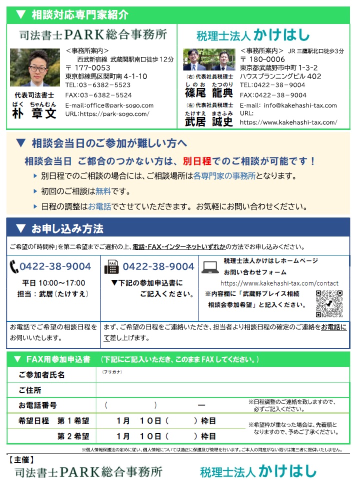 税理士法人かけはしは、司法書士PARK総合事務所との共催による「司法書士と税理士による無料相続個別相談会」を以下のとおり開催いたします。
